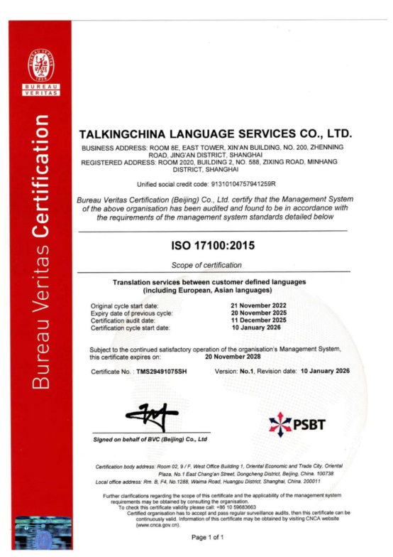 Den ISO 17100 Standard ass ee vun den héchste Branchenstandarden fir Iwwersetzung. Den 10. Januar huet TalkingChina fir d'zweet Kéier erfollegräich d'ISO 17100:2015 Zertifizéierung vum Iwwersetzungsmanagementsystem kritt, wat beweist, datt TalkingChina d'Ufuerderunge vun den héchsten Iwwersetzungsstandarden op der Welt an alle Beräicher erfëllt, vun der Qualitéit vun den Iwwersetzungsdéngschter bis zur professioneller Kompetenz vun den Iwwersetzer.